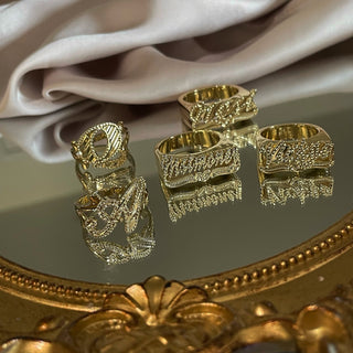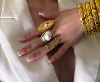 Select styles are offered in luminous gold and understated silver.
